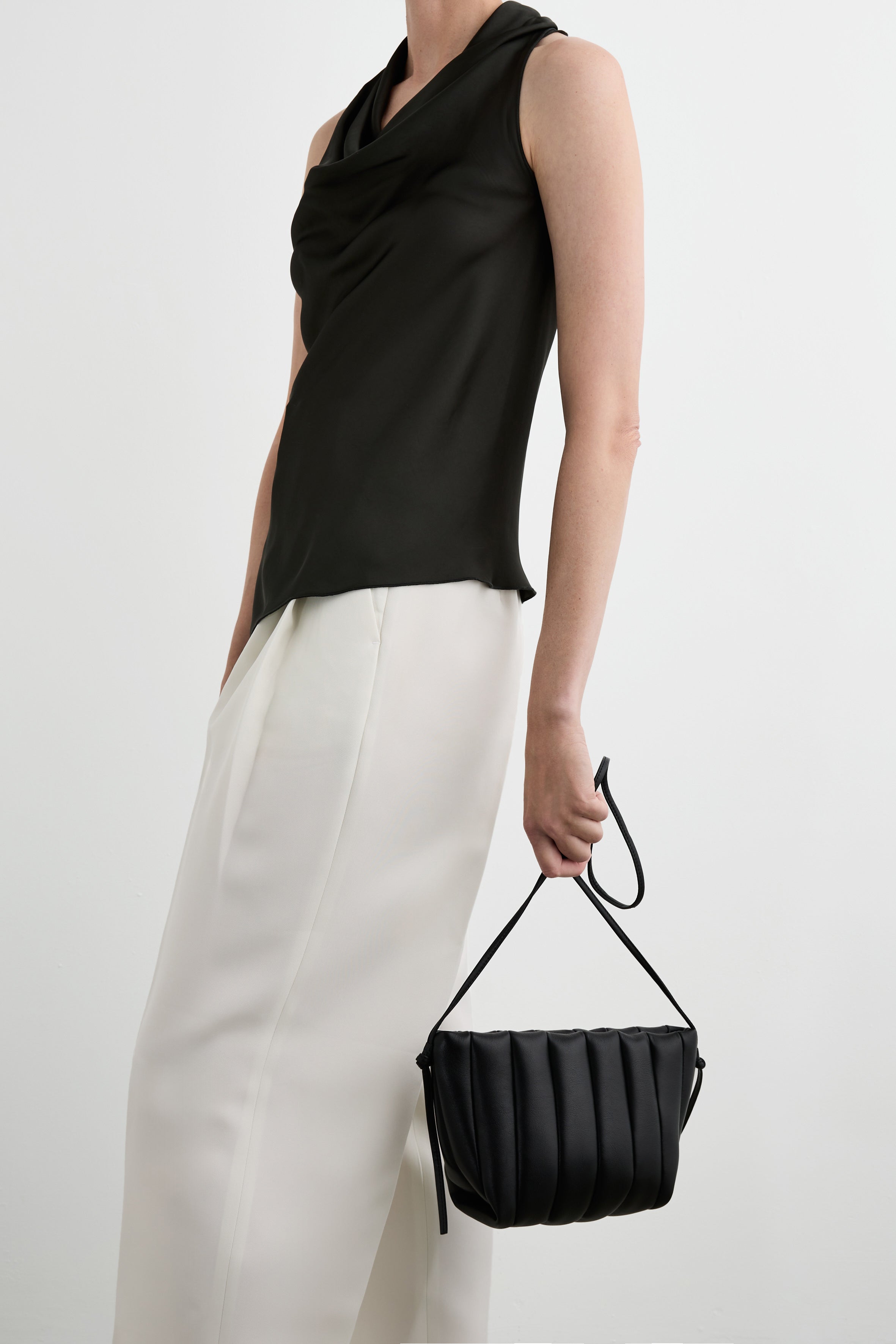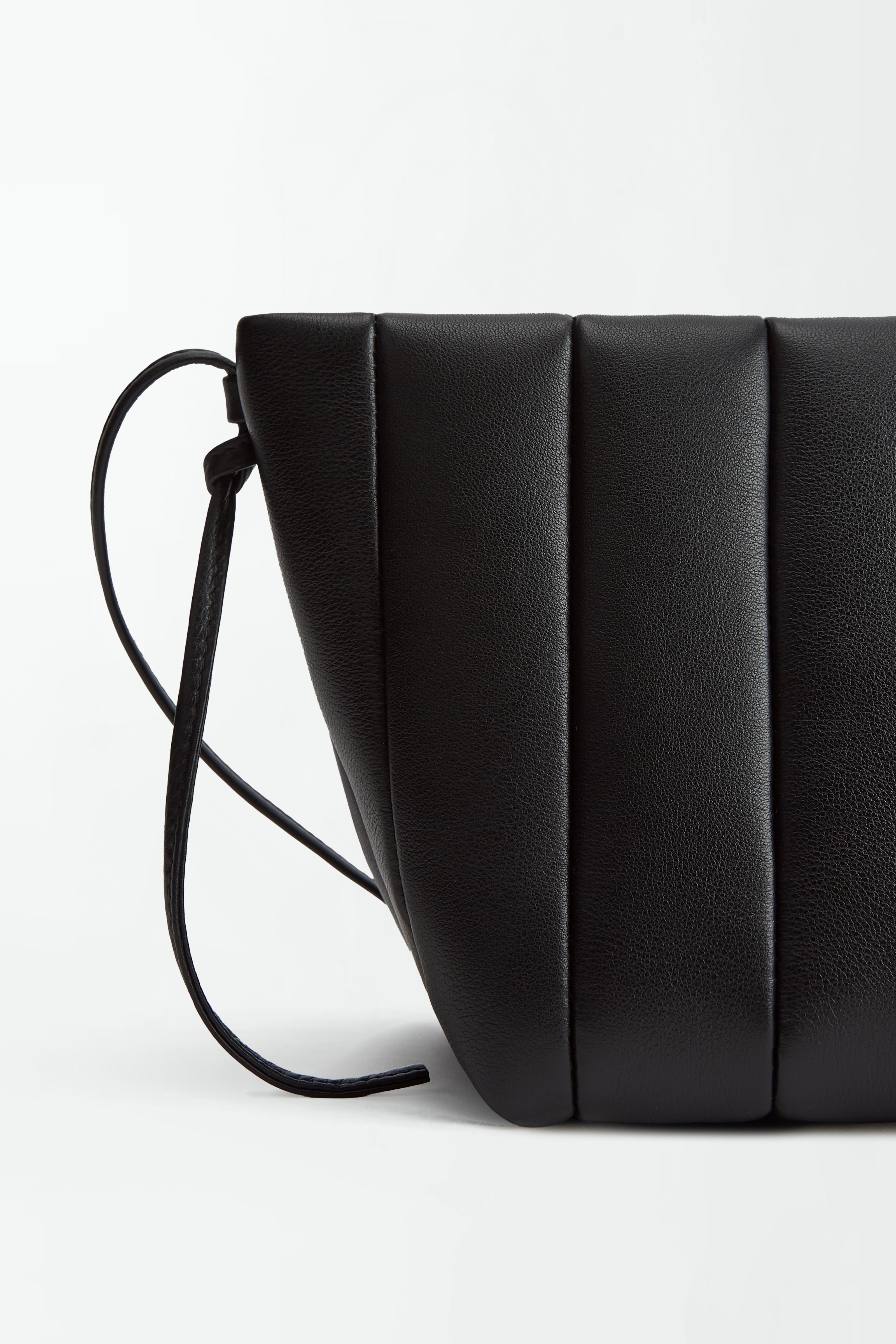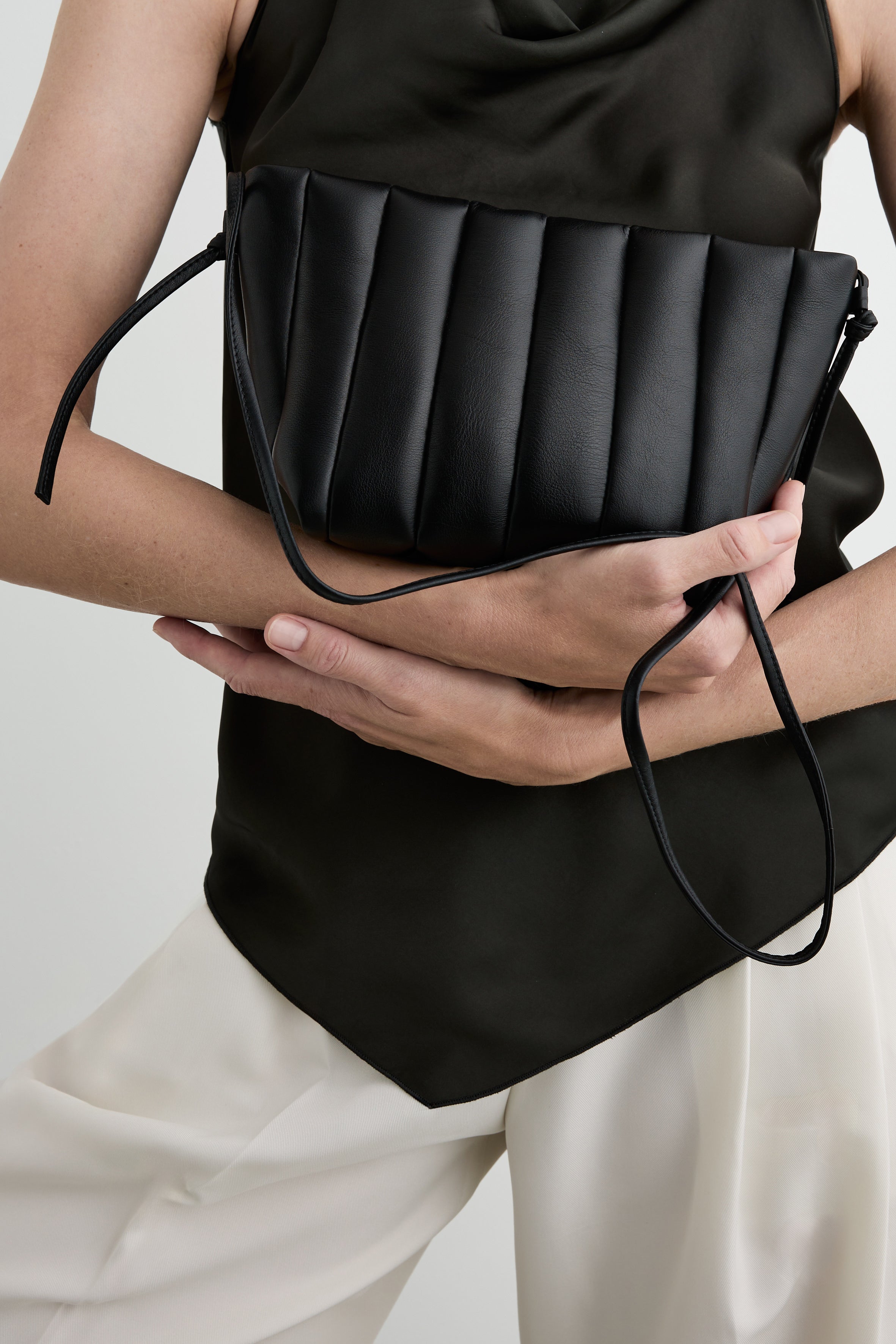 The Boulevard is a more versatile form of our pouch. Its rhythmic padded leather grooves are supported by a slender adjustable strap that allows you to wear it at the desired length.