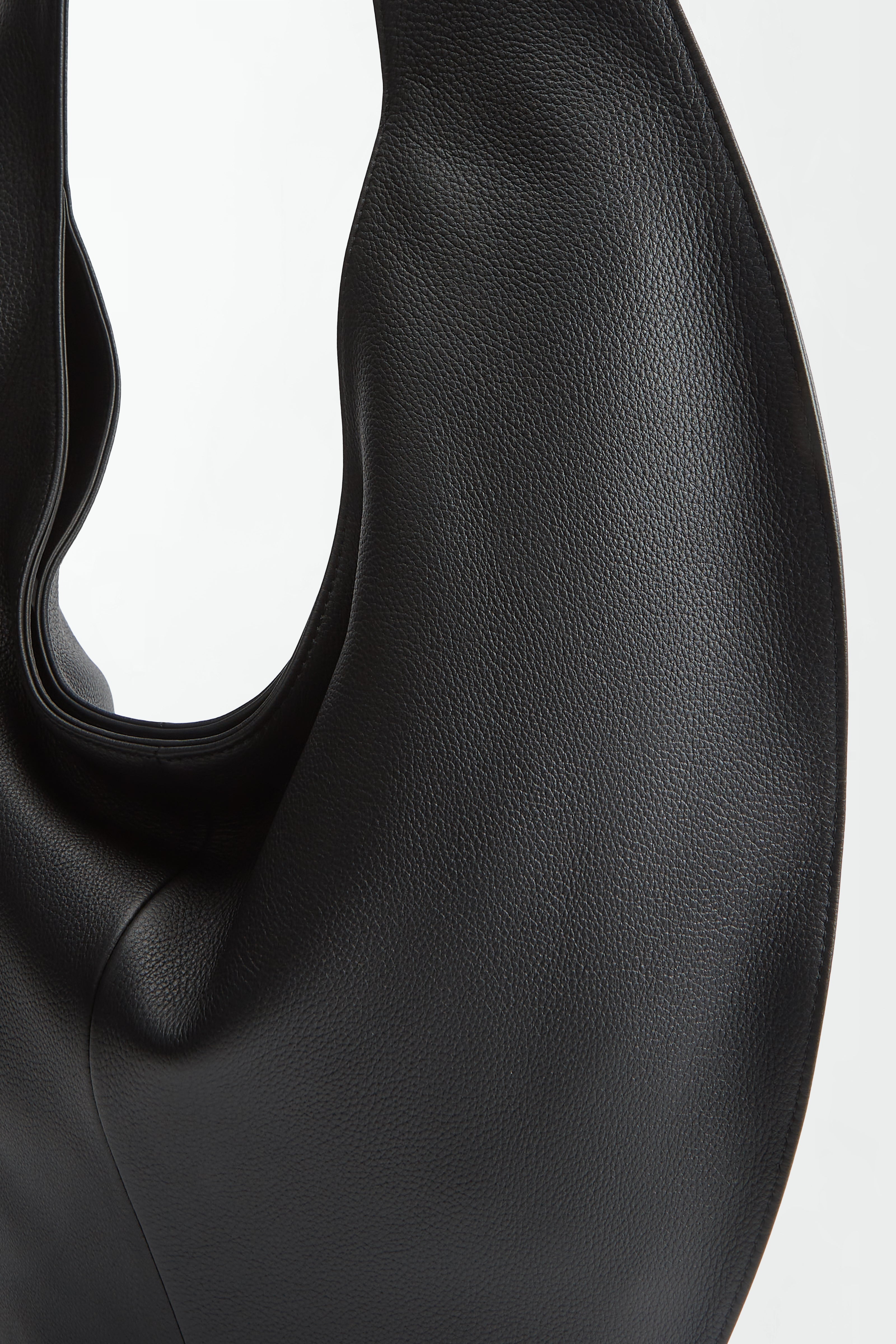 The Market Tote features a pebble full grain leather exterior and a soft nappa leather interior lining with pockets. Its round shape, paired with tapered straps, ensures a comfortable fit on the body, allowing for easy slinging over the shoulder. The generous interior provides ample space, complemented by a magnetic closure and zipper pocket.