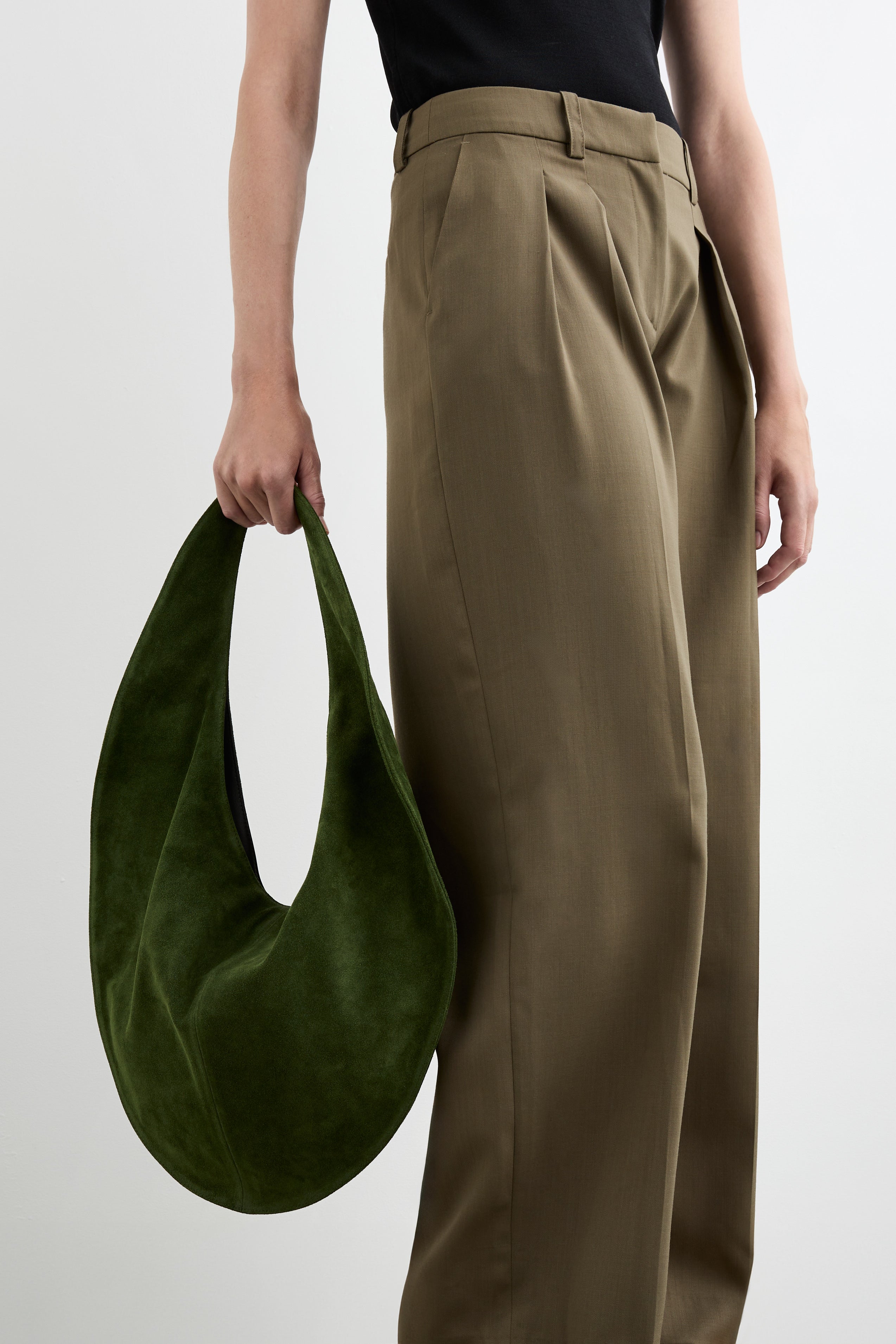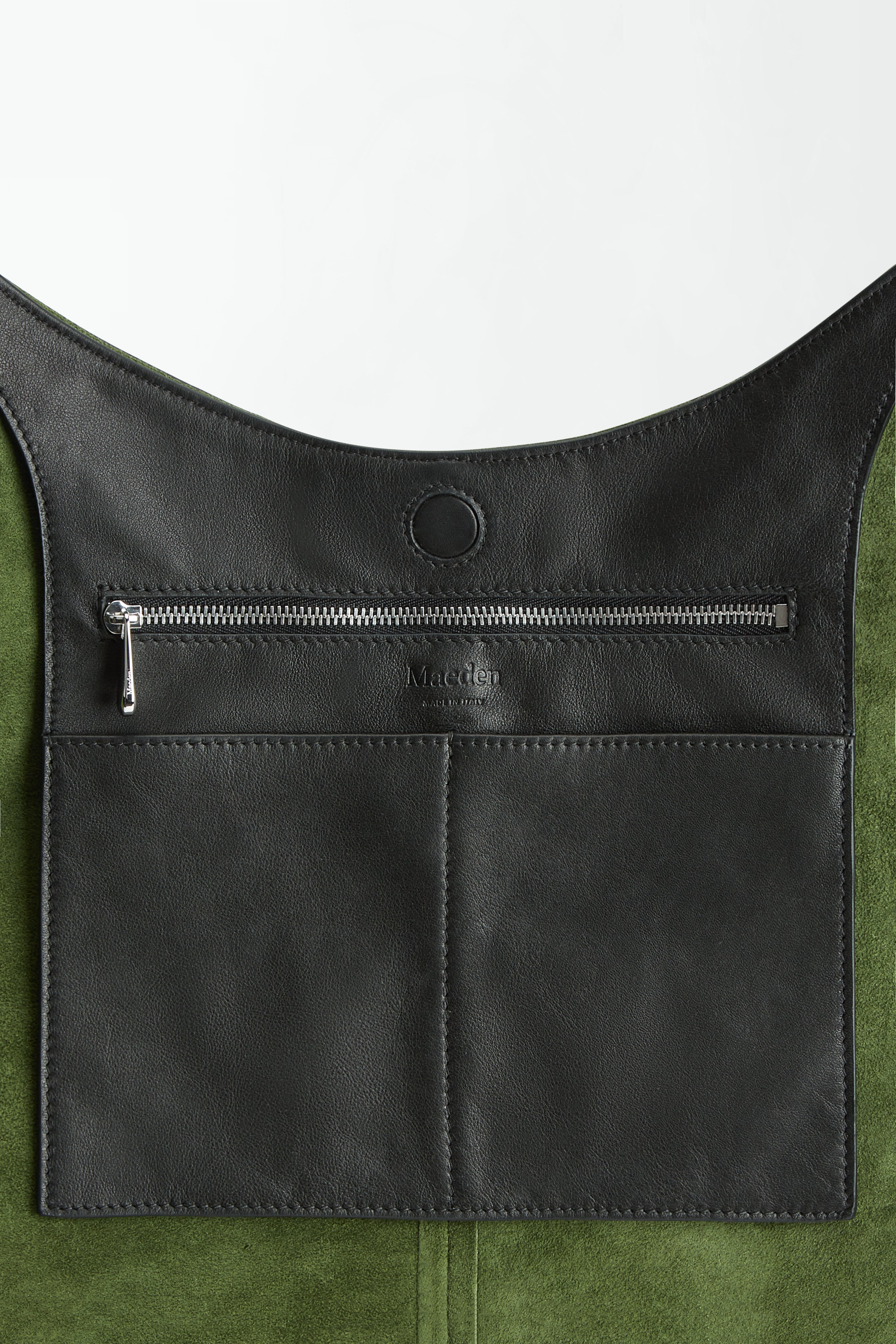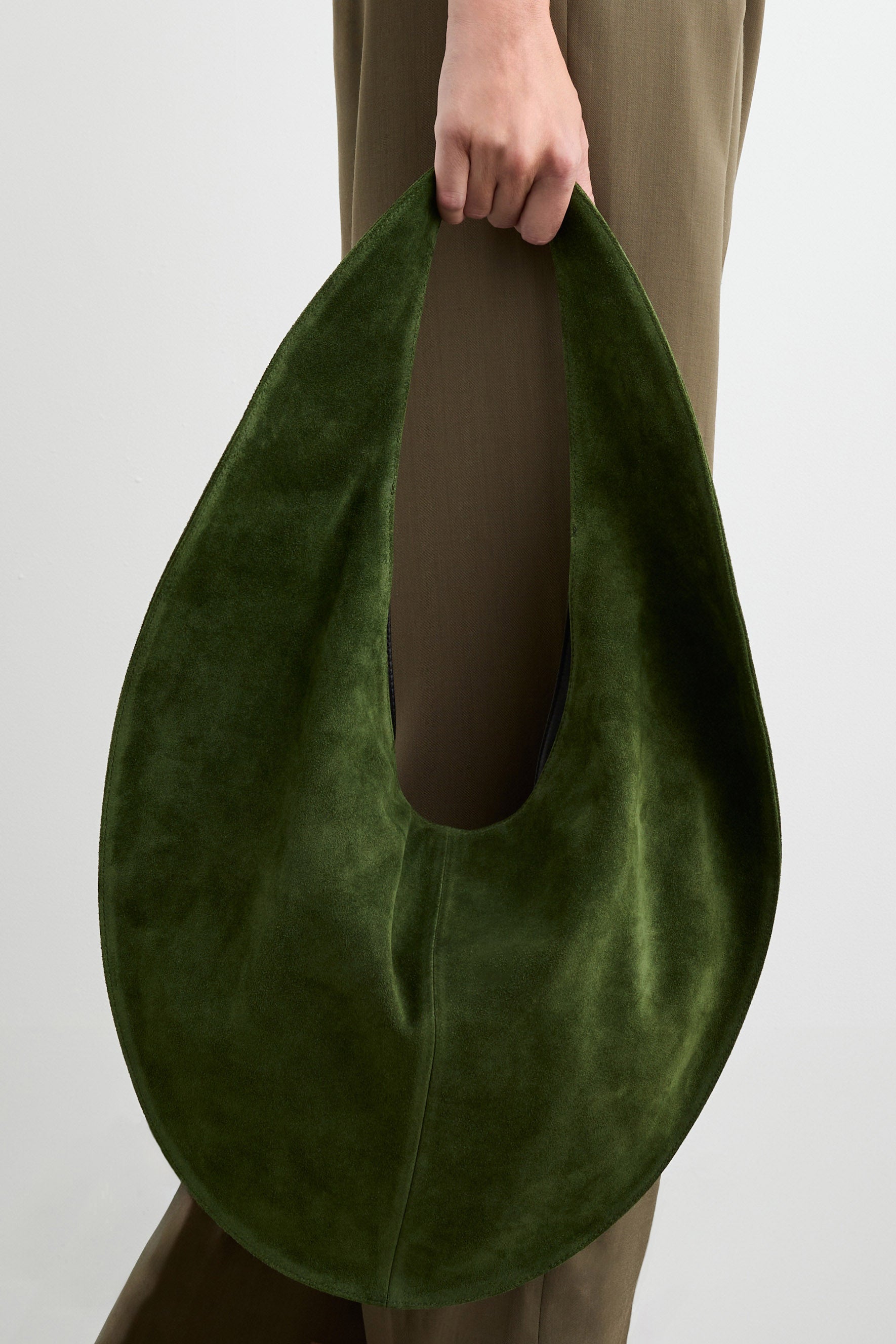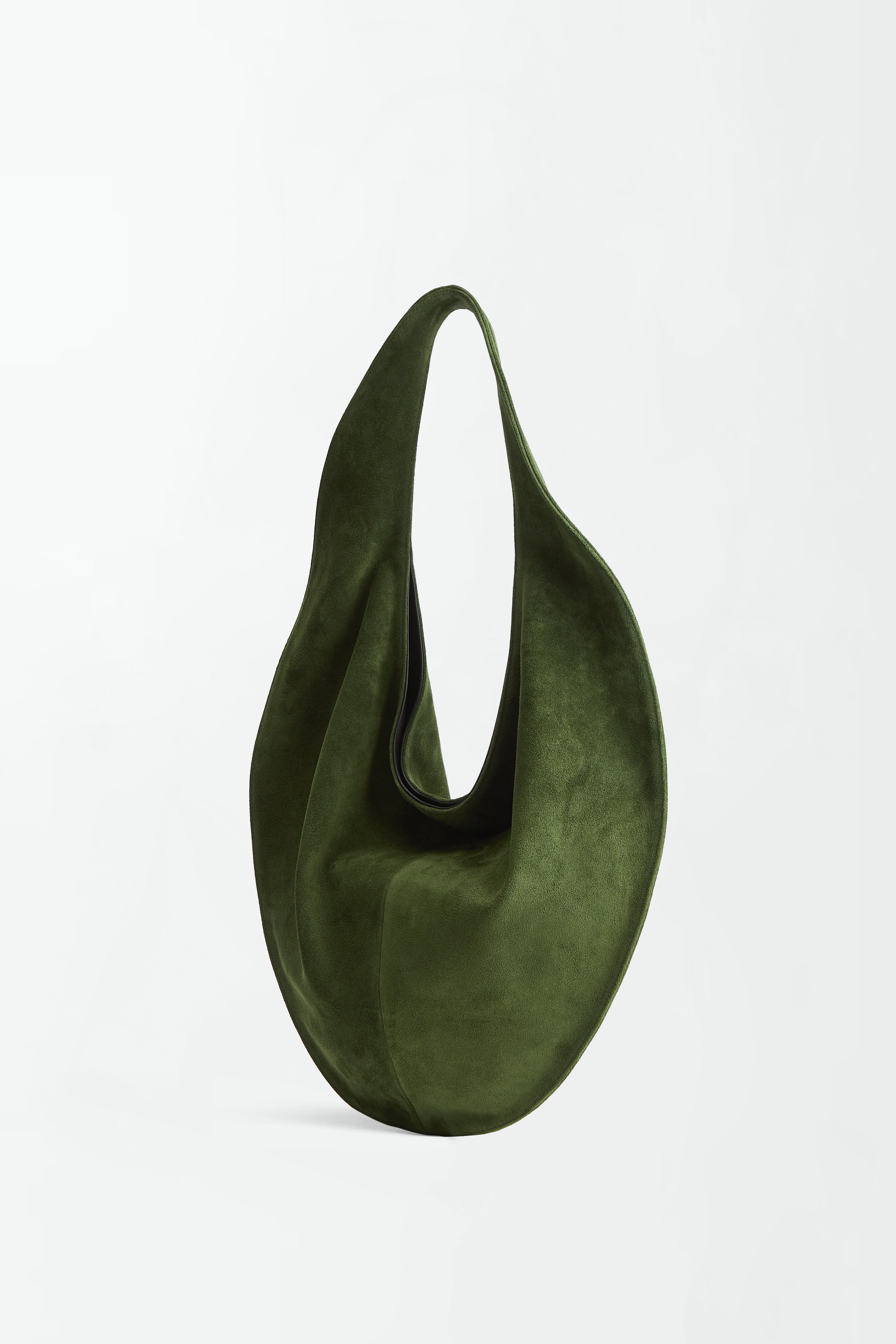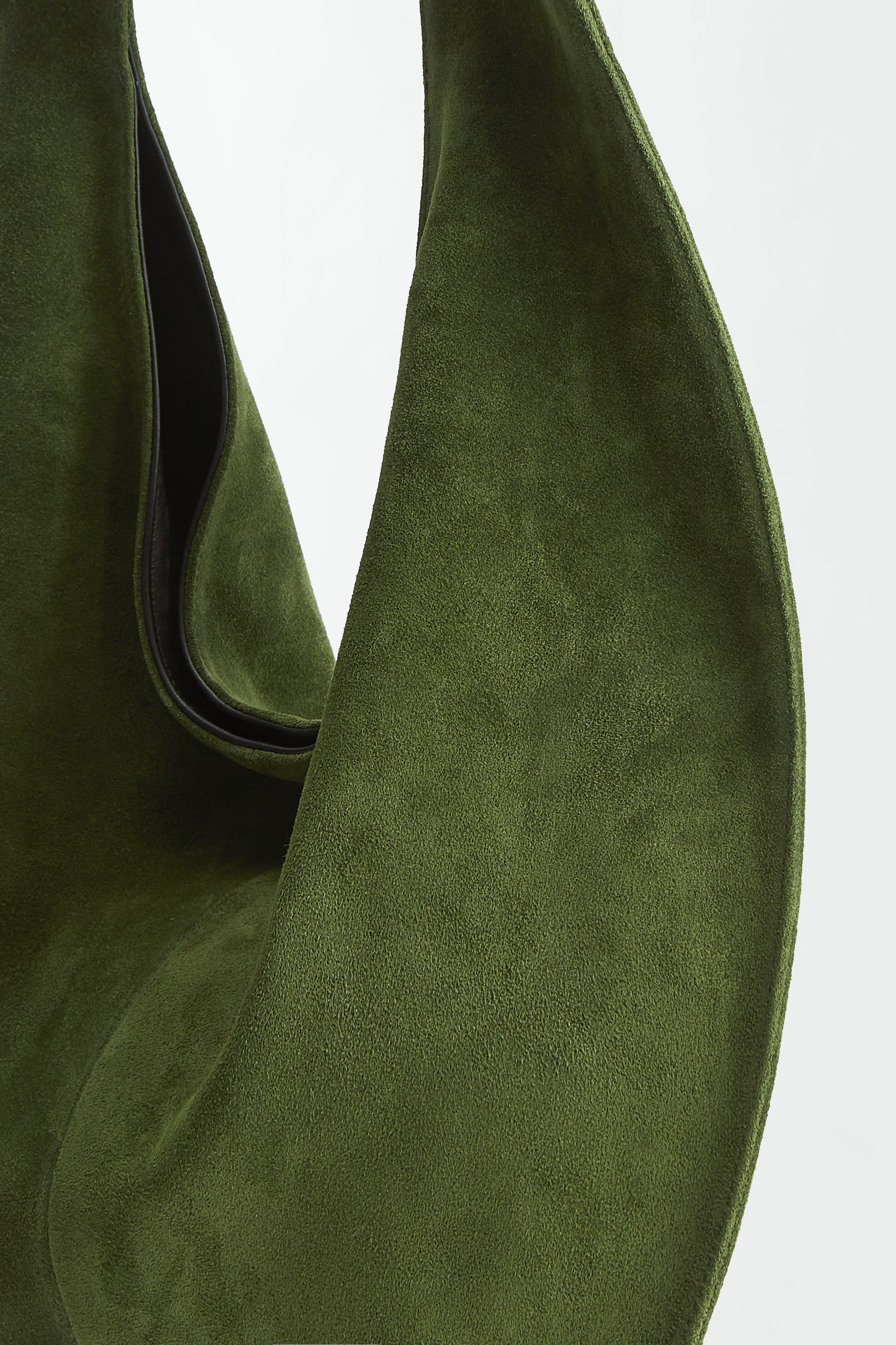 The Market Tote features a smooth suede exterior and a color-matching nappa leather interior lining with pockets. Its round shape, paired with tapered straps, ensures a comfortable fit on the body, allowing for easy slinging over the shoulder. The generous interior provides ample space, complemented by a magnetic closure and zipper pocket.