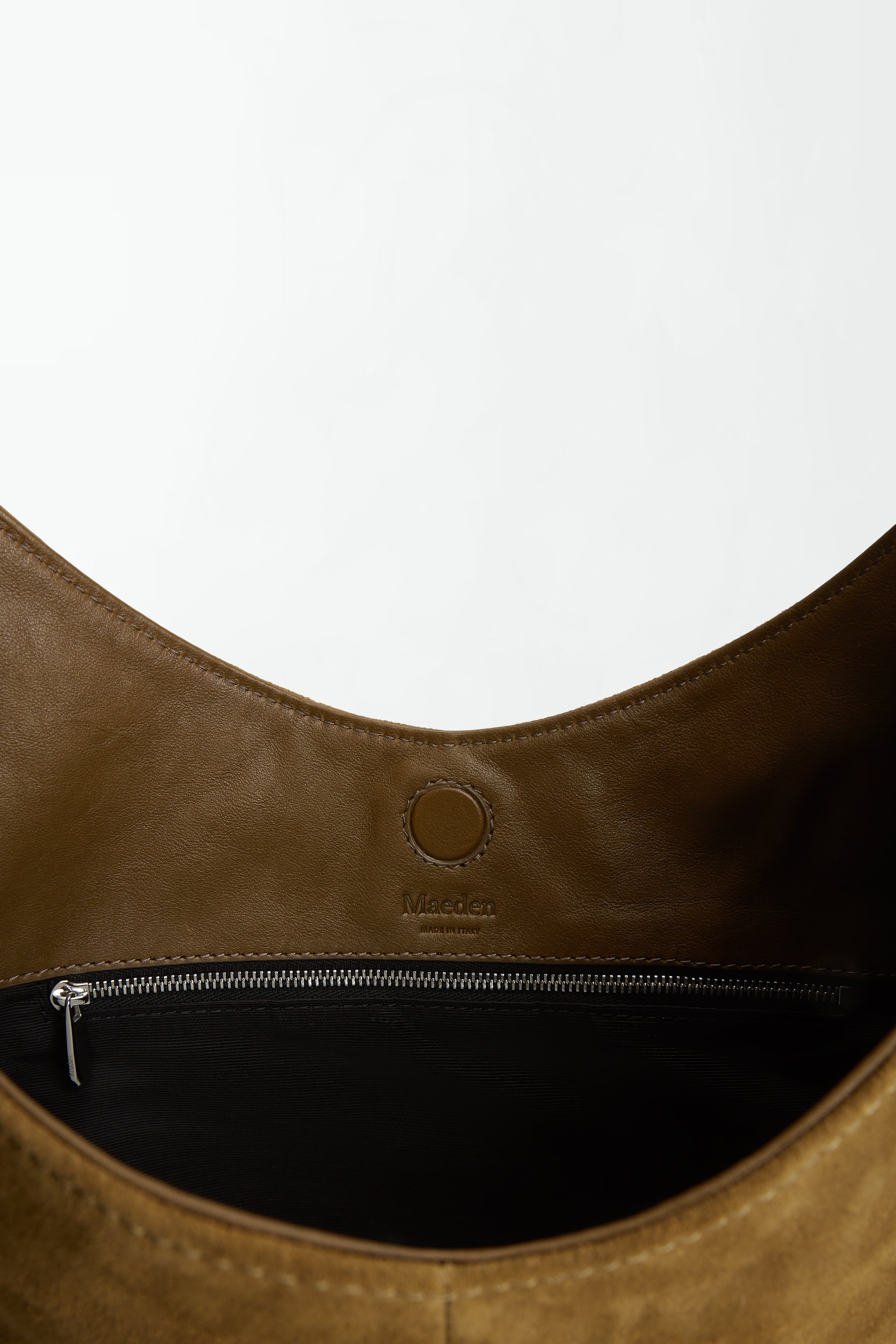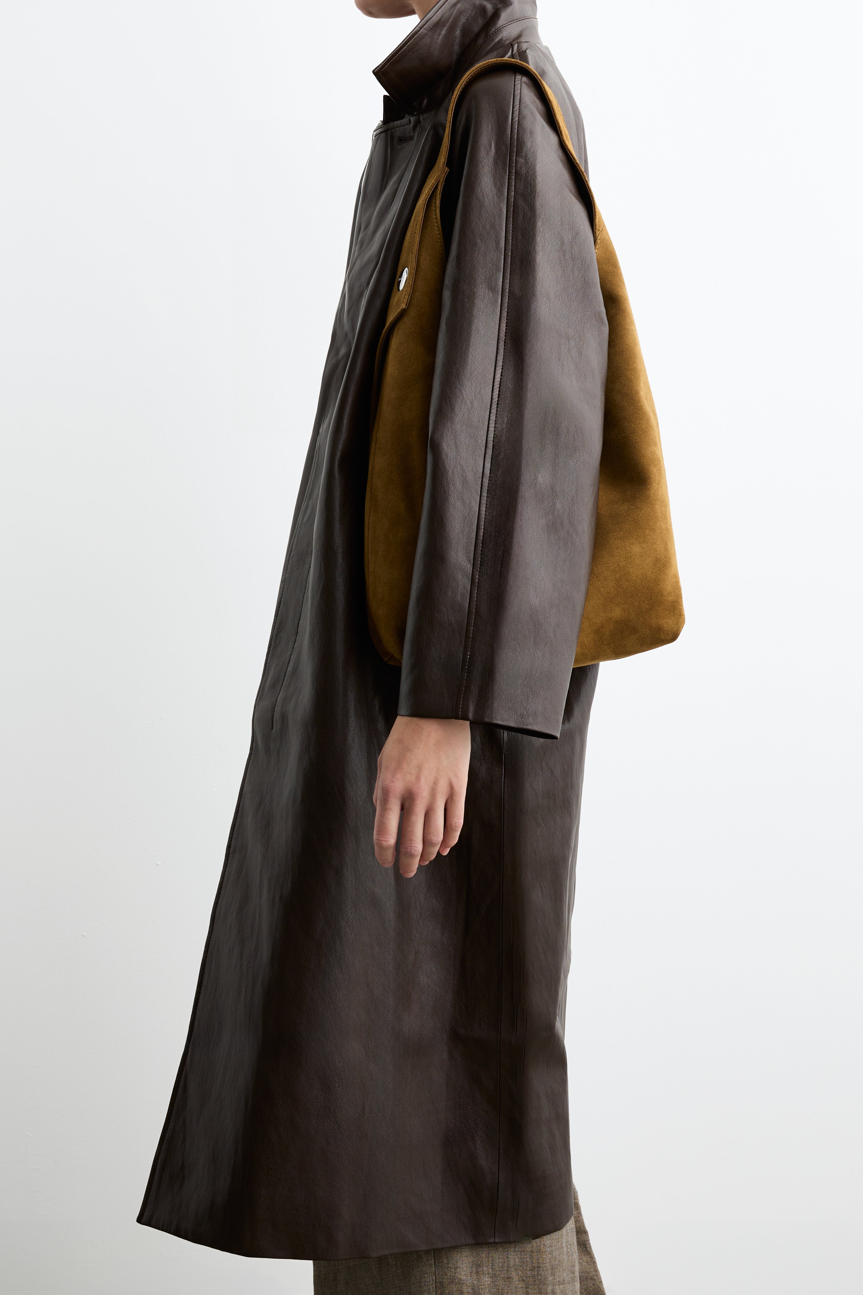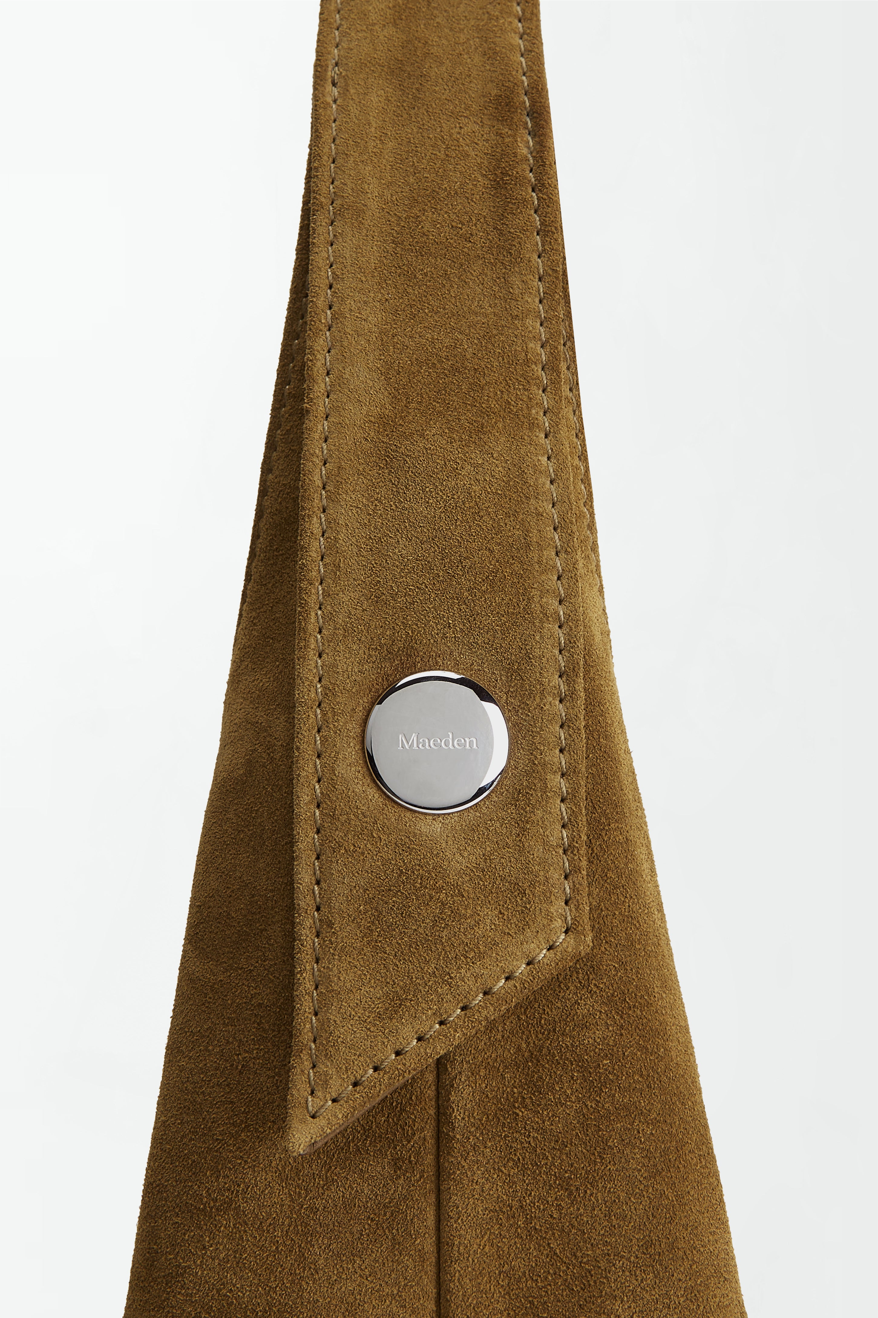 Crafted from ultra-soft suede with a pronounced texture that catches the light, the material adds depth and richness. The underside of the strap is lined with color-matched leather for a subtle contrast and a more elevated feel. The strap connects with a branded rivet that sits like a brooch at the chest when worn over the shoulder.