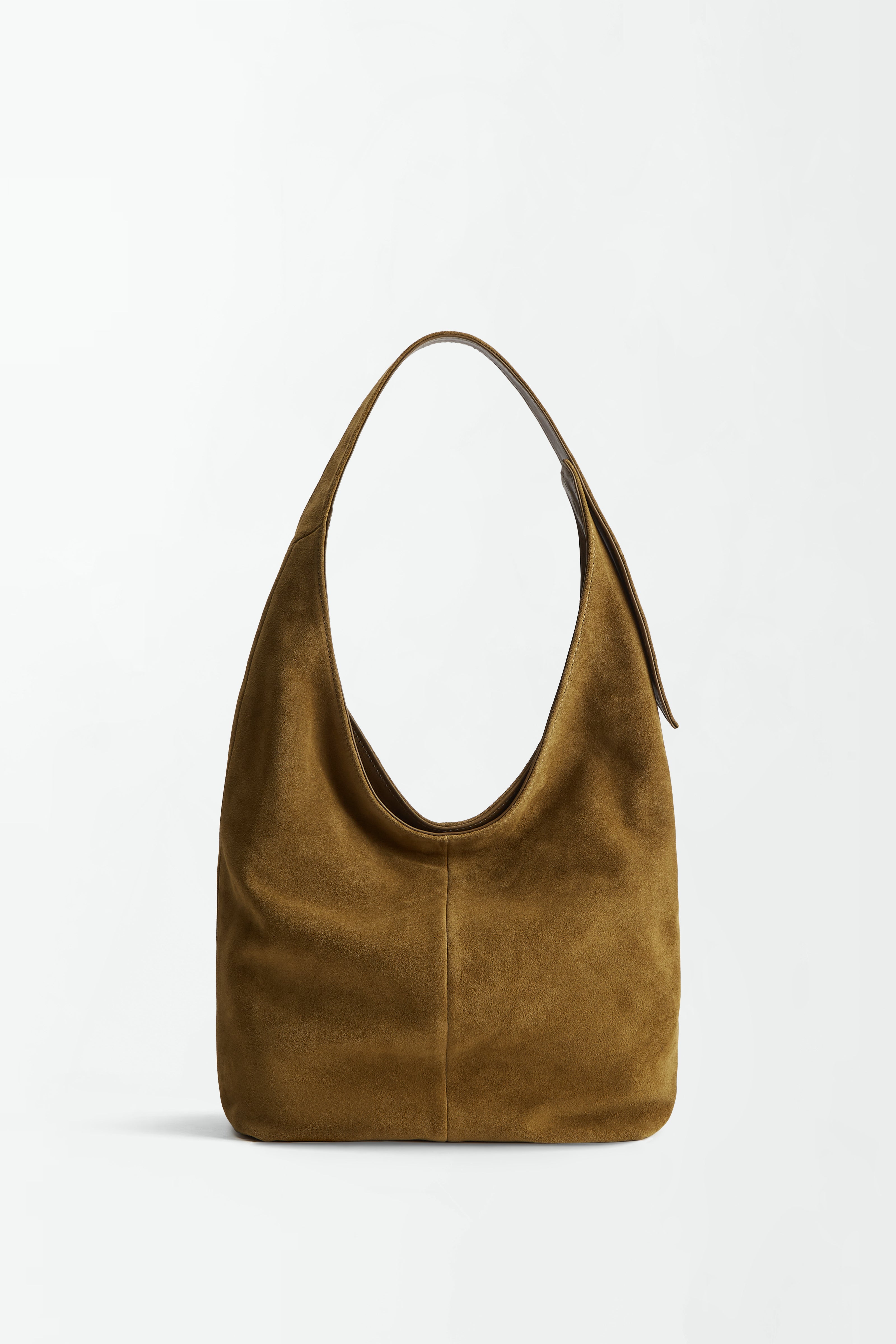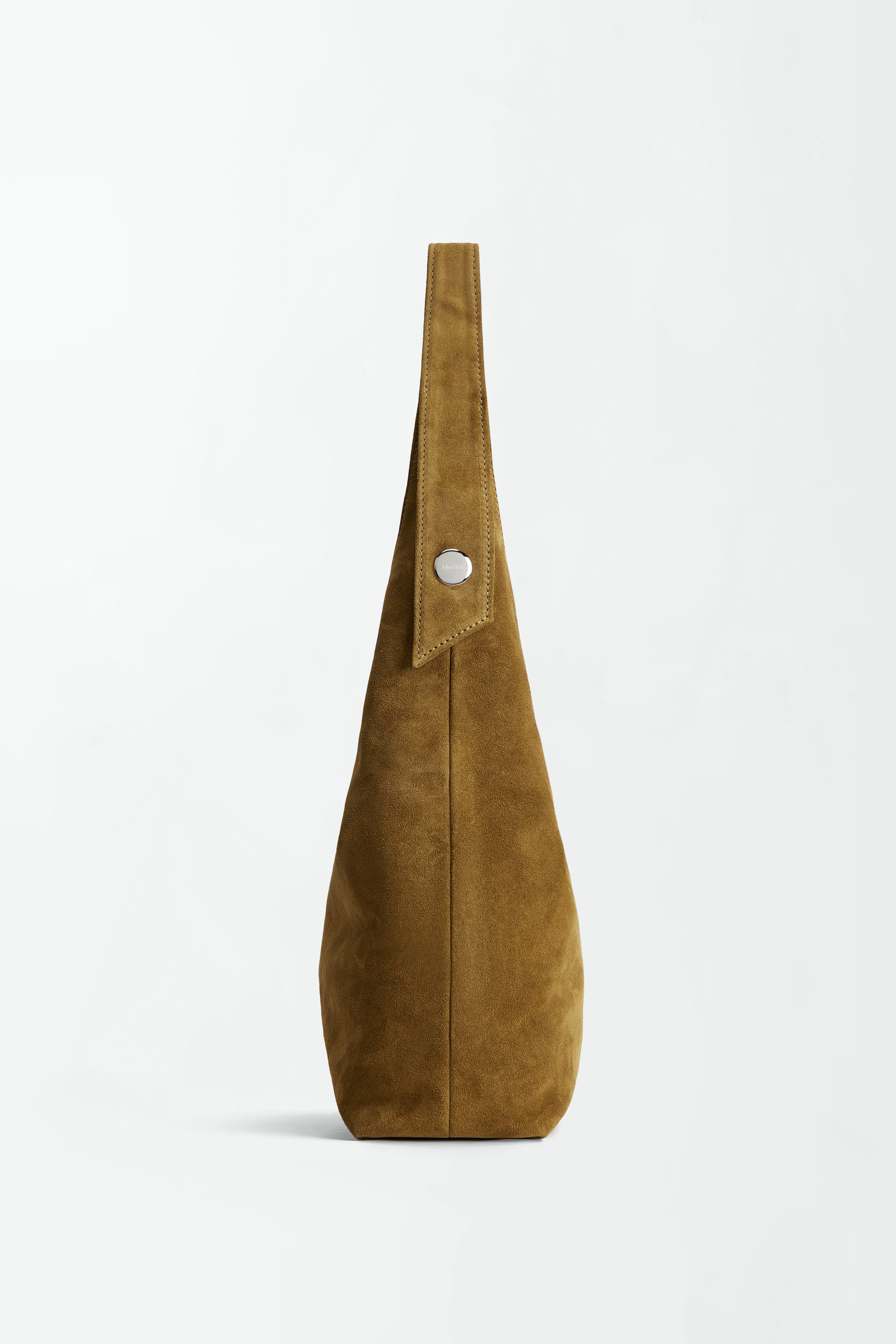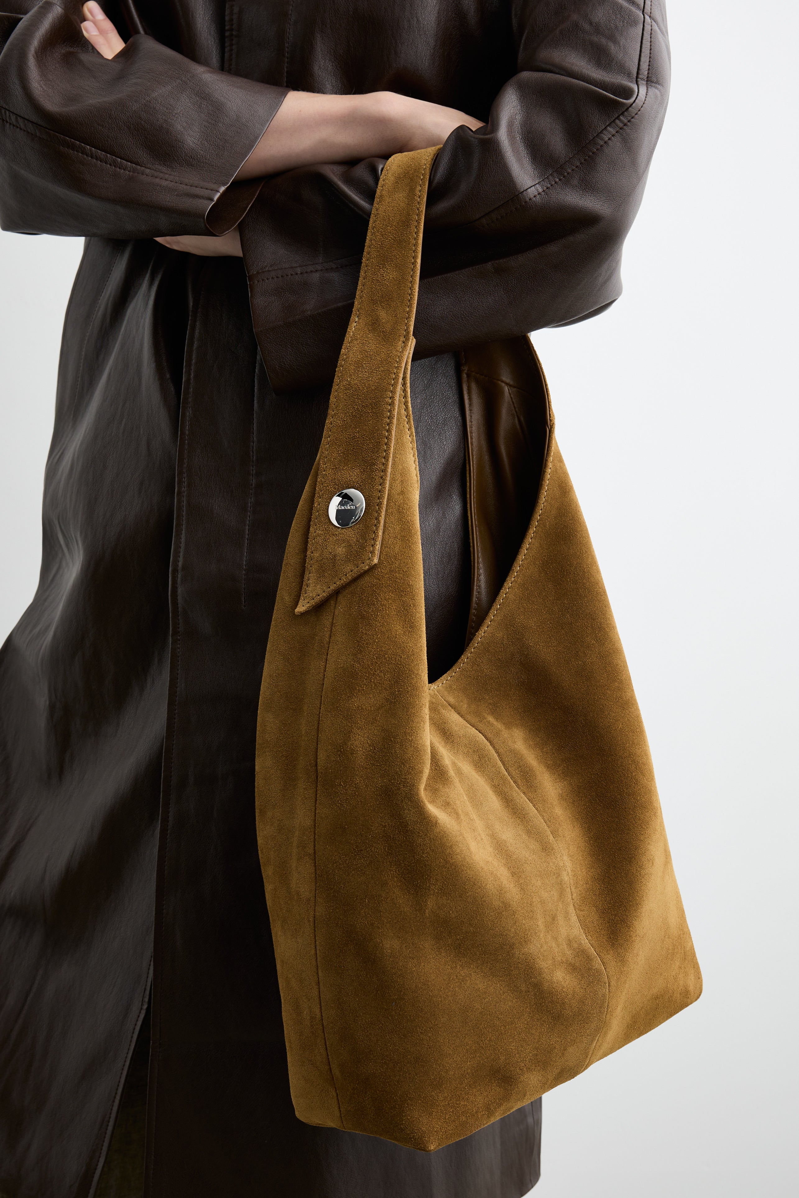 Crafted from ultra-soft suede with a pronounced texture that catches the light, the material adds depth and richness. The underside of the strap is lined with color-matched leather for a subtle contrast and a more elevated feel. The strap connects with a branded rivet that sits like a brooch at the chest when worn over the shoulder.